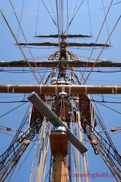 A bordo di Nave Vespucci in navigazione./i pennoni con le vele imbrogliate.