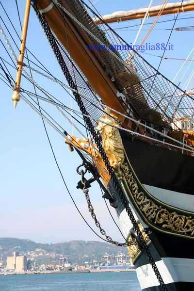 A bordo di Nave Vespucci in navigazione./la prora (prua) con la polena e gli arabeschi in foglia d'oro.